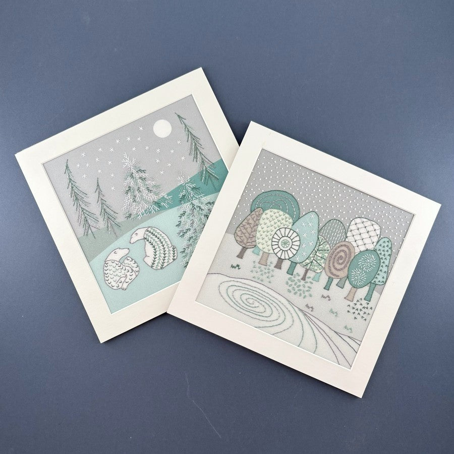 Winter trees embroidery pattern with bears embroidery pattern, both in white square mounts. Shown on a navy blue background.