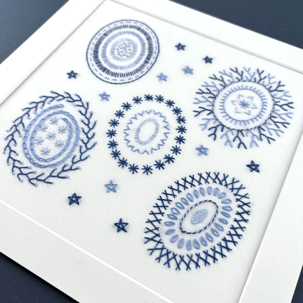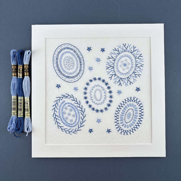 Completed embroidery design in a square white mount shown with 3 skeins of dark blue, blue and light blue DMC threads. Shown on a navy blue background.