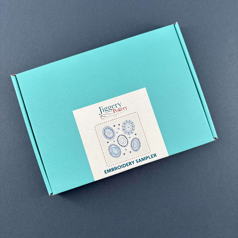 Learning embroidery kit in a labelled turquoise mailing box. Shown on a dark blue background.