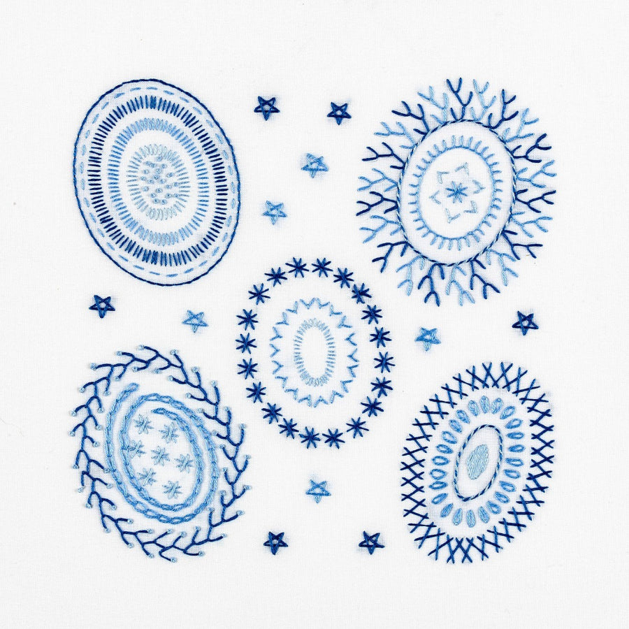 The embroidery design shows 5 oval shapes created using simple stitches done in dark blue, mid blue and pale blue on a white background