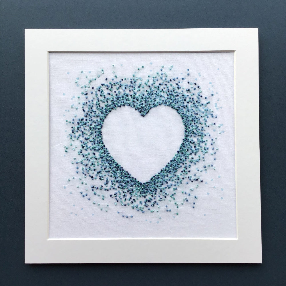 The finished hearts embroidery pattern measures 25x25cm (10x10 inches). It is designed to fit into a square frame 30x30cm (12x12 inches) with a display area measuring 20x20cm (8x8 inches), sometimes called the aperture.