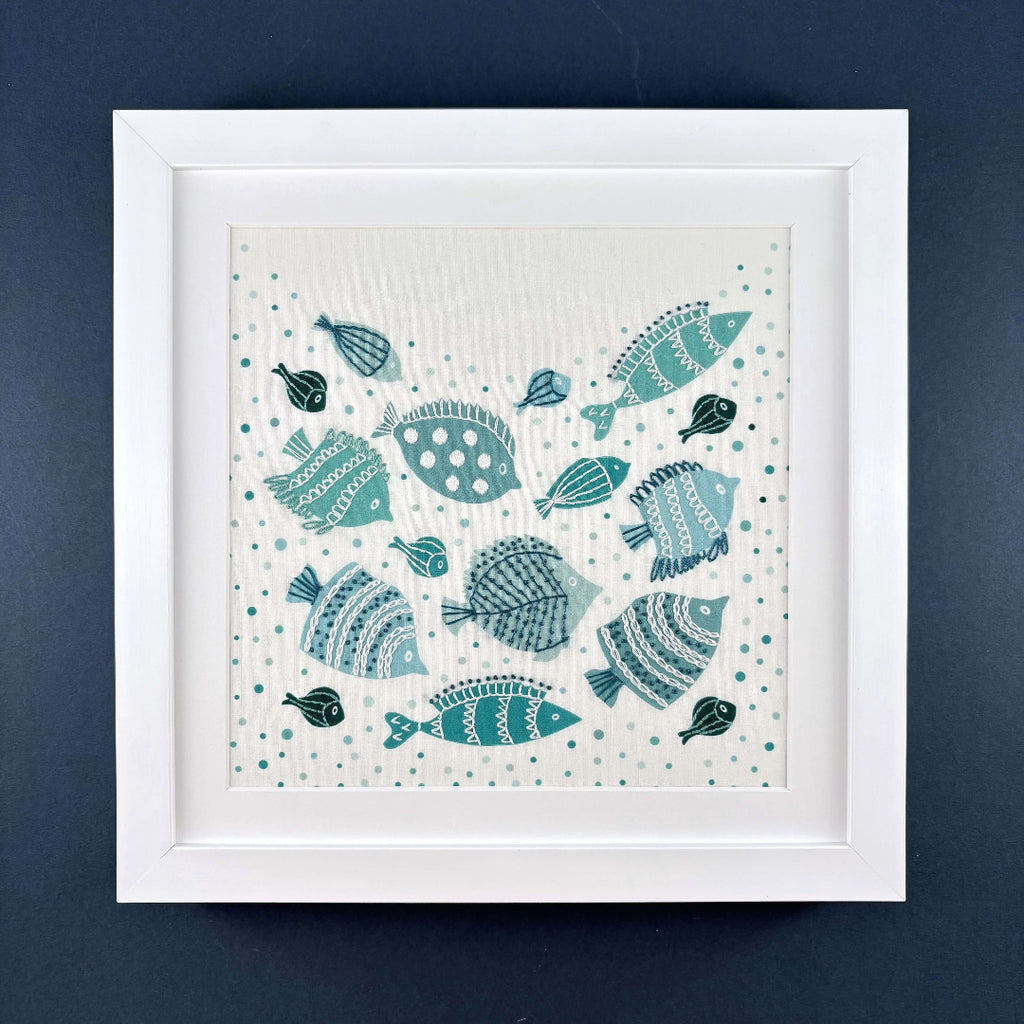 Fish embroidery pattern showing a shoal of teal, green and blue fish swimming against a background of printed bubbles.