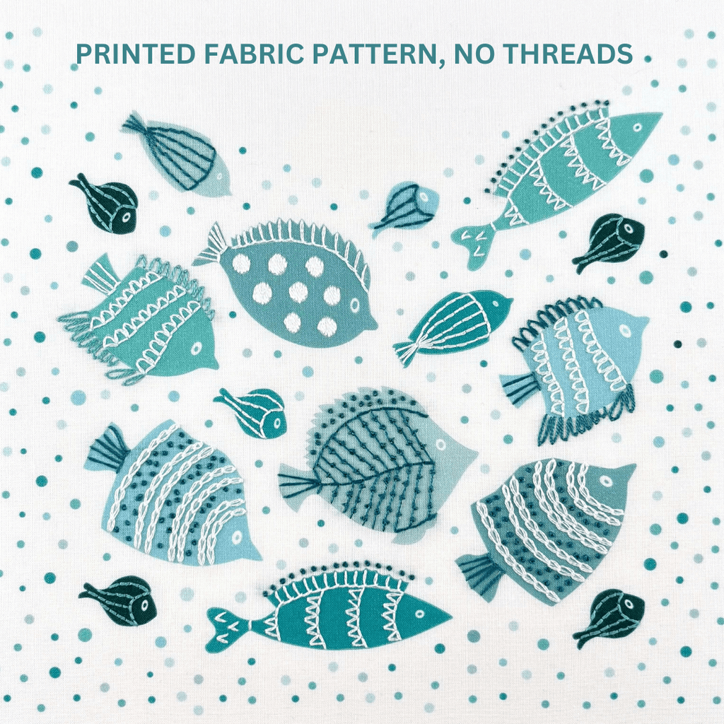 The fish embroidery pattern creates a group of fish swimming through bubbles which are printed on the fabric. The pattern comes printed on fabric ready for you to stitch on top. You can use your own embroidery threads, but if you want your embroidery to look the same as mine I include the thread colours I used in my instructions.