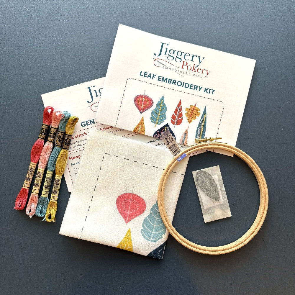 Embroidery kit with wooden hoop, 4 skeins of DMC thread, needles and needle threader in a bag, instructions and the leaf pattern printed on fabric.