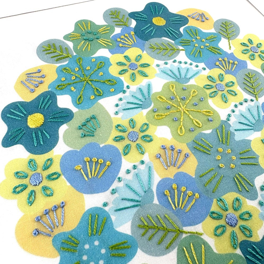 A close-up image of blue, yellow, green, teal and turquoise flowers with simple embroidery stitches done on top of the pre-printed fabric.