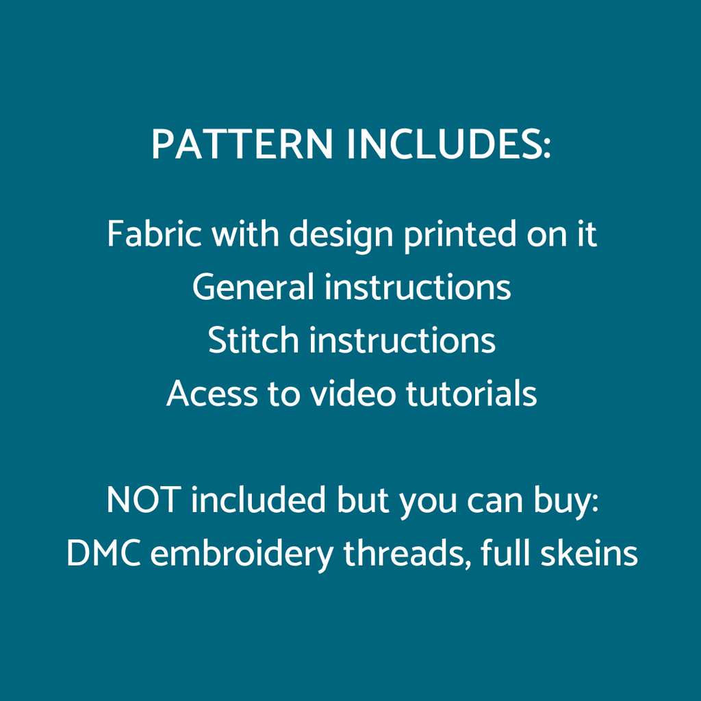 This spring flowers embroidery design also comes as a full embroidery kit which includes everything you need: wooden hoop, threads, needles and needle threader as well as the pre-printed fabric and instructions. So the kit is the best option for beginners who don't have embroidery equipment already.