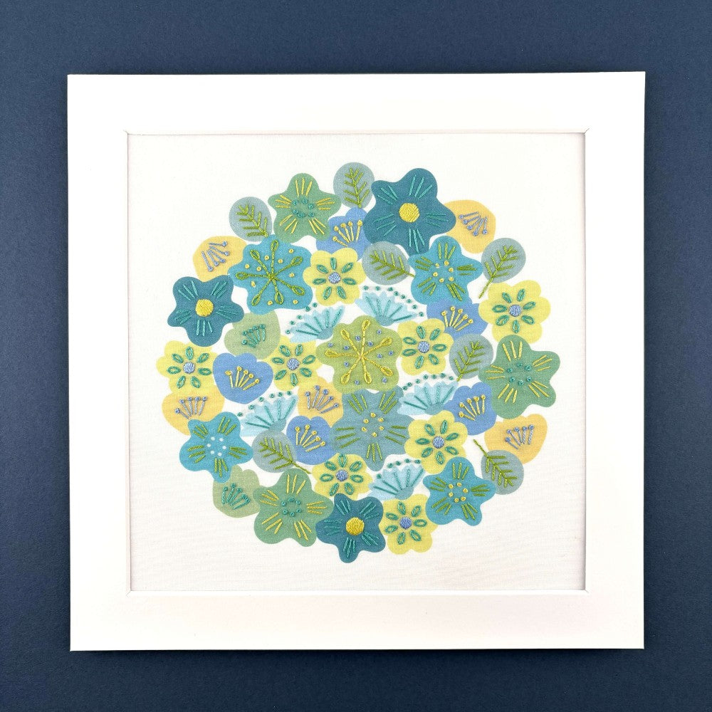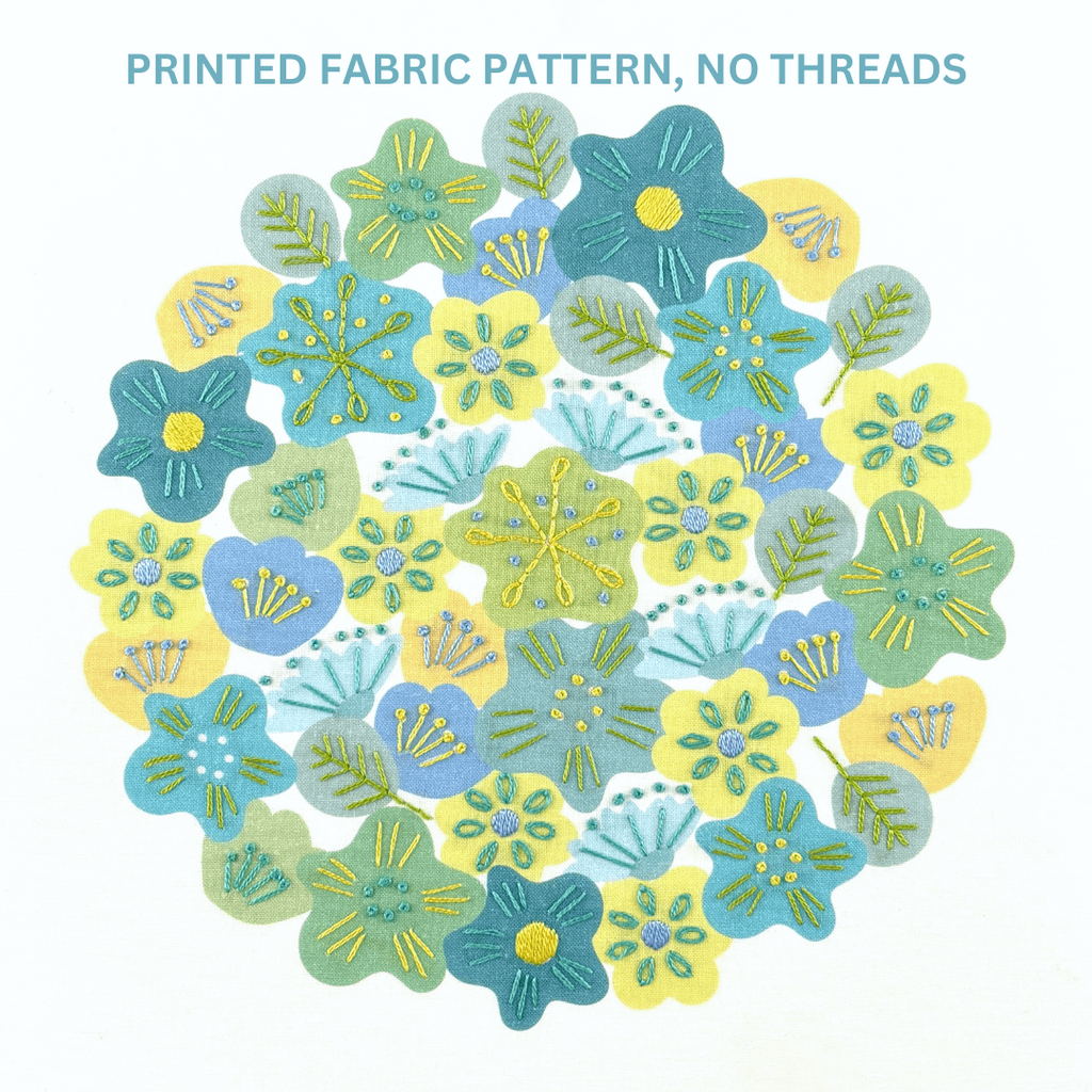 The spring flowers embroidery pattern creates a circle of colourful yellow, green, blue and turquoise flowers. The design comes printed onto fabric in colour, ready for you to stitch on. The embroidery stitches are straightforward so this pattern is a great choice, whether you're a beginner or an experienced stitcher looking for a relaxing springtime project.