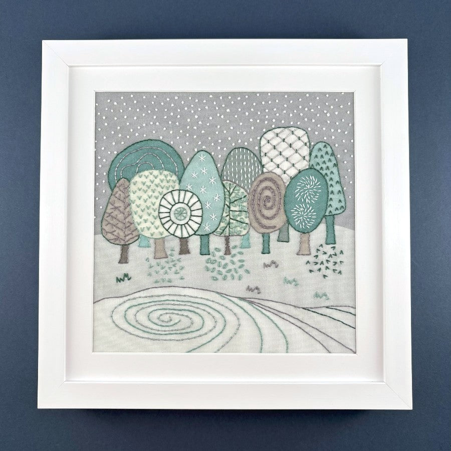Winter trees embroidery pattern shows a group of stylised trees in front of a frozen lake with grey snowy sky in the background.